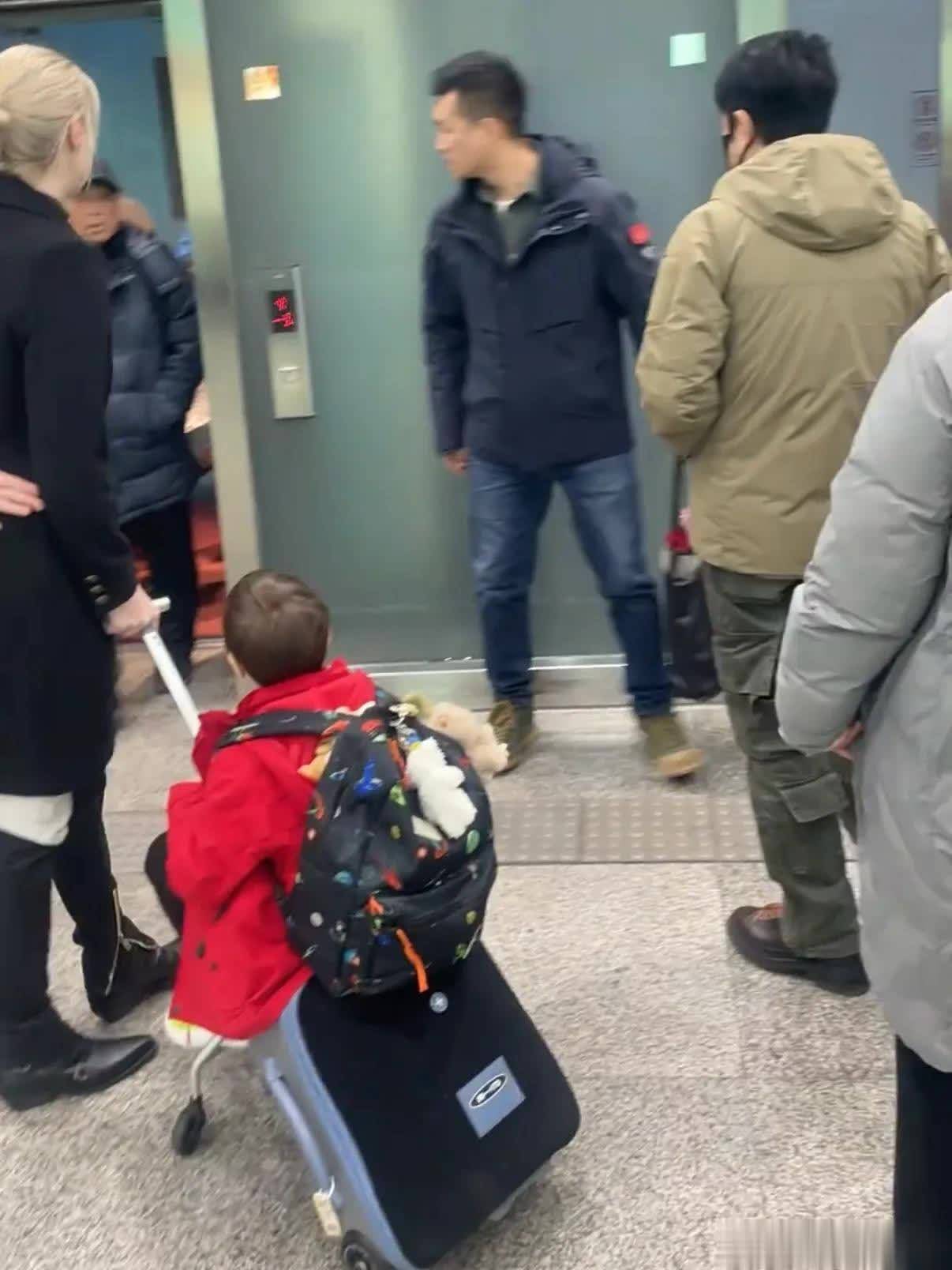 画面里,撒贝宁与妻子李白各带一个孩子,6岁的龙凤胎子女坐在行李车上代步。撒贝宁身着绿色外套,戴着口罩,打扮低调,他拉着坐行李车的女儿等待电梯,见到镜头友善地打招呼。女儿皮肤白皙,混血特征显著,模样极为软萌可爱。