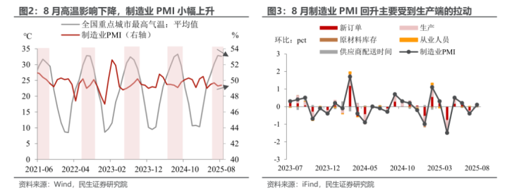 伴随着极端天气的散去,8月制造业PMI迎来了低位企稳。历年夏季,PMI与全国平均气温多呈负相关关系,背后的原因可能系高温环境会影响工业正常开工进度,从而压低PMI景气度。相较于7月,8月虽然我国部分地区仍存在极端天气的影响,但强度和持续性有所减弱,从而成就了8月制造业PMI的小幅边际上行。