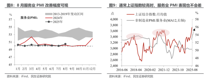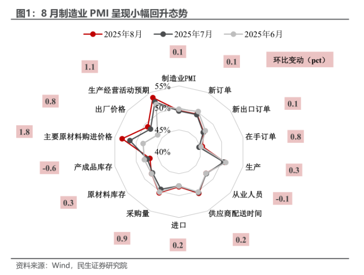 8月PMI如期止跌,但回升的背后则是制造业和服务业不同的成色。随着极端天气等短期扰动消退、“反内卷”政策压力减缓,8月制造业PMI初现低位企稳,较7月小幅回升0.1pct,但仍处于荣枯线之下,反映当前经济仍面临企业补库偏弱、就业承压等结构性挑战。相较之下,服务业PMI不仅站稳景气区间线上股票配资网站,反弹幅度也更为可观。资本市场的持续活跃,预计将为三季度服务业乃至整体经济企稳注入更多活力,也有助于在一定程度上对冲制造业放缓压力。具体来看: