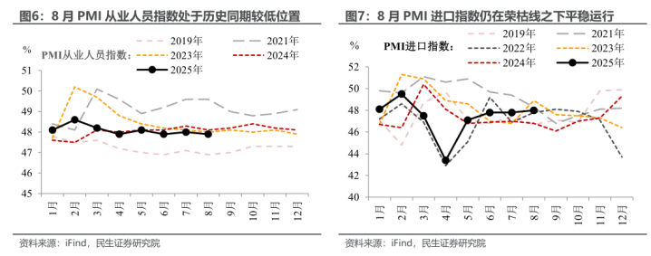 与此同时,就业与进口形势暂未发生明显改善。8月PMI从业人员指数季节性放缓至47.9%,处于历史同期较低位置。同时,代表内部需求的另一指标,PMI进口指数还在荣枯线以下平稳运行,这是内需仍在复苏通道的又一印证。