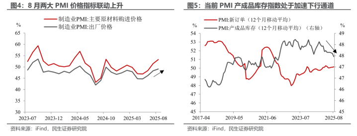 “反内卷”对价格的提振卓有成效。8月PMI两大价格指标均有了比较明显的提升,两大价格指标的联动上升再度证明了“反内卷”对缓解供需矛盾、支撑价格上升的效果显著。不过需要注意的是,无论是从PMI数值、还是环比增幅来看,代表上游价格的PMI原材料购进价格指数(8月上升3.1pct至51.5%)表现均要好于代表下游的PMI出厂价格指数(8月上升2.1pct至48.3%),这说明“反内卷”对于上游价格的改善更胜一筹,而上游价格的复苏并未完全传导至下游。