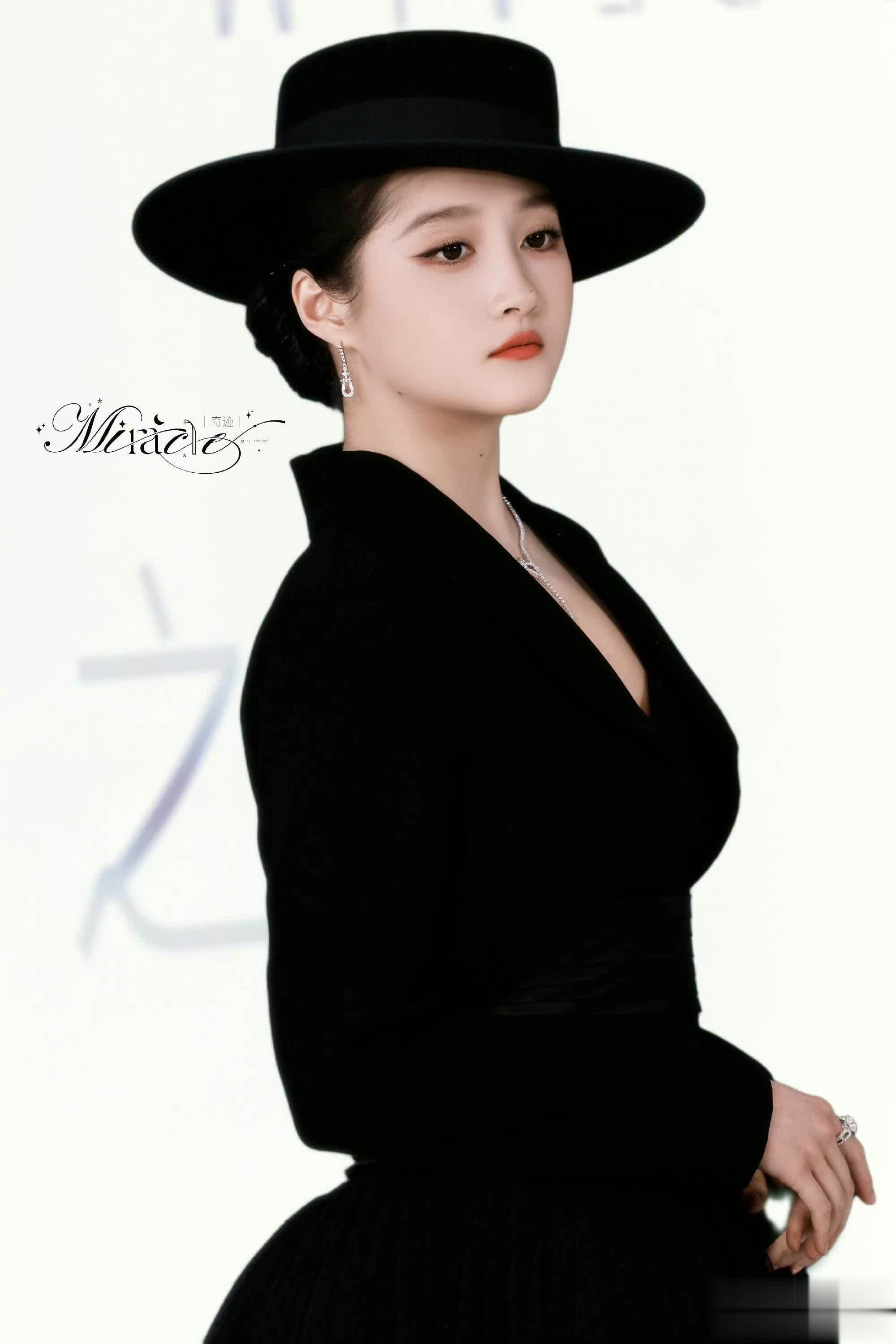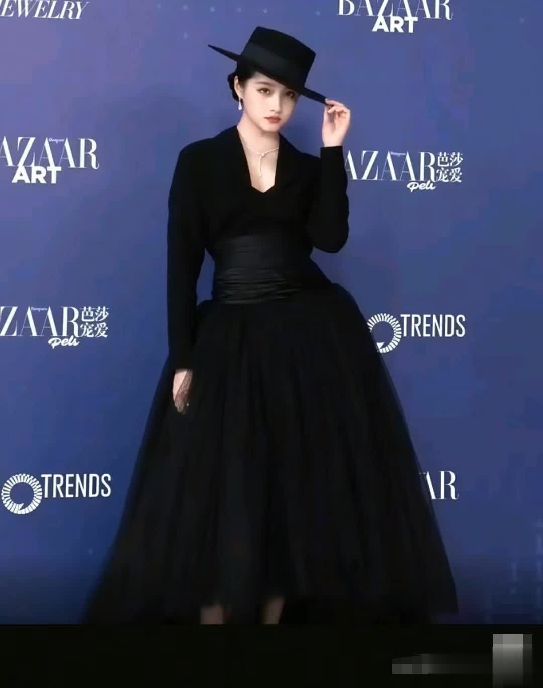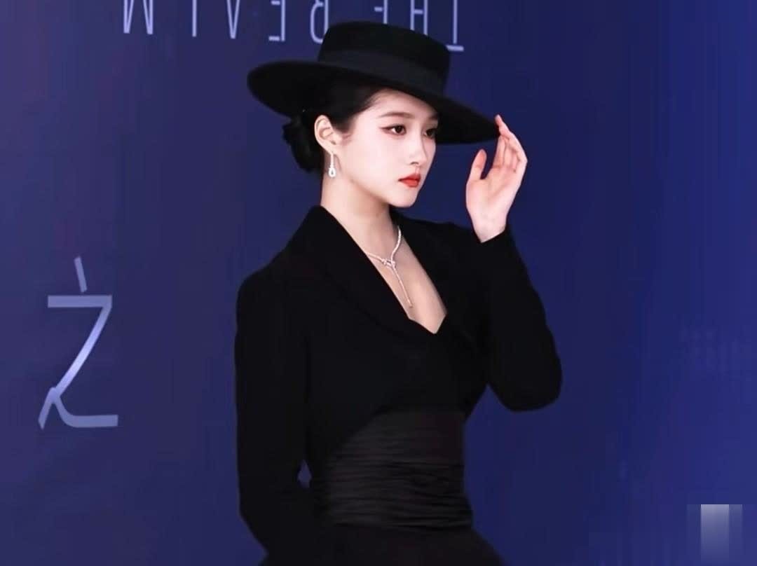关晓彤此次全黑色系亮相,黑色宽檐圆顶礼帽成为关键配饰,半遮面设计营造出神秘氛围,被网友调侃为“特务G式摩登”。