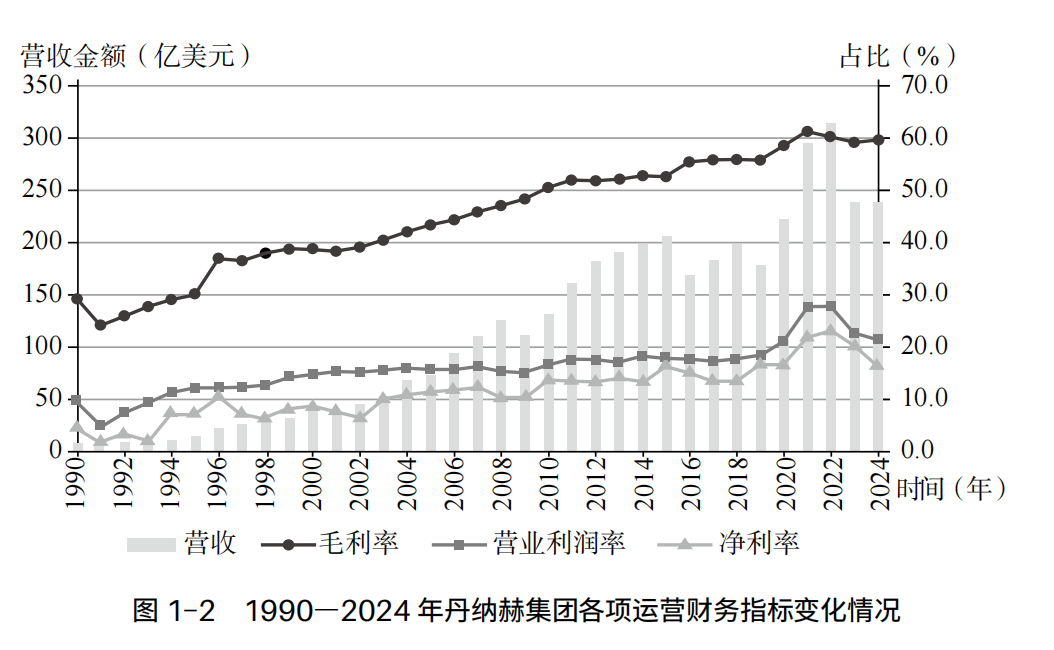 通过图 1-2 我们可以看出,丹纳赫集团从 1990 年起一直有计划性地改善各项运营财务指标,营收从 1990 年不到 10 亿美元,一直增长到了 2022年的约 315 亿美元,营收年均复合增长率约为 12%,毛利率水平在 32 年间提升了约 30%,营业利润率则提升了约 20%,净利润率提升了约 20%。