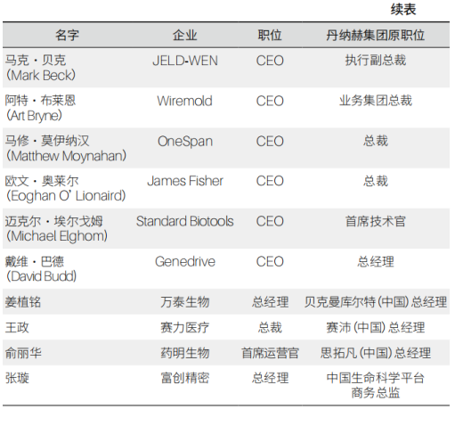 最近几年,中国 A 股上市公司也开始任命丹纳赫集团前高管为核心管理层(见表 1-1)。如万泰生物在 2024 年初任命丹纳赫(中国)贝克曼库尔特(Beckman Coulter)前总经理姜植铭女士为企业总经理,富创精密在2023 年 12 月任命丹纳赫(中国)生命科学平台原商务总监张璇女士为总经理,塞力医疗(维权)总裁王政为丹纳赫(中国)赛沛前总经理,药明生物首席