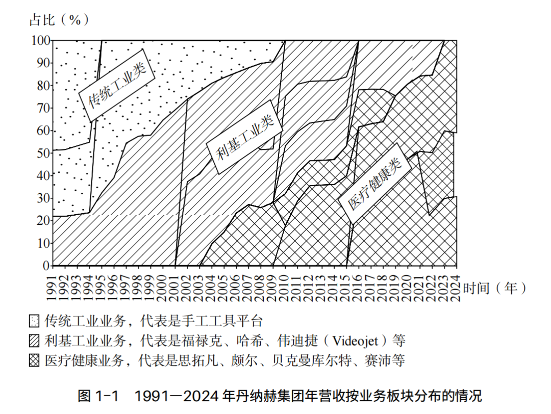图 1-1 展示了丹纳赫集团 1991—2024 年营业收入按业务板块分布的情况:圆点区域代表传统工业业务,斜线区域代表利基工业业务,方格区域则代表医疗健康业务。