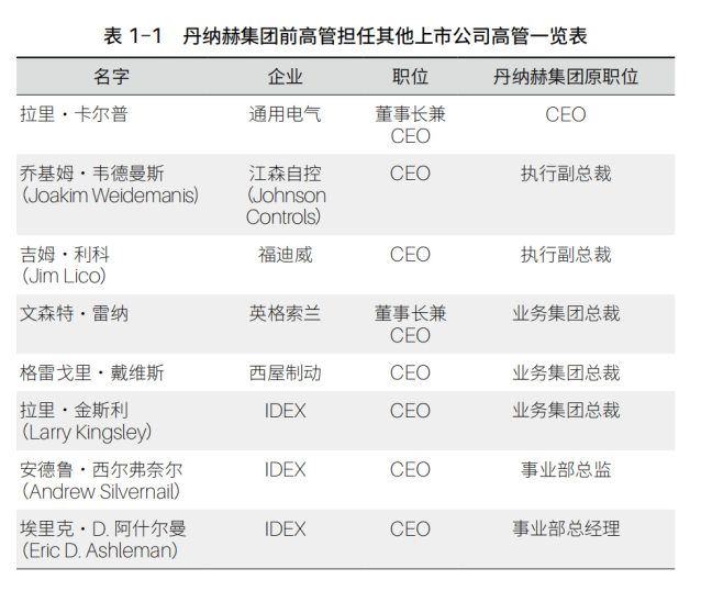 丹纳赫是比肩 IBM、宝洁和通用电气的 CEO 摇篮。1990 年,创始人拉尔斯兄弟任命职业经理人乔治·谢尔曼(George Sherman)执掌集团,此后丹纳赫集团又换了三任 CEO,每一次都很顺畅和成功。 除“自产自用”CEO之外,丹纳赫还为其他上市公司输送了很多的一号位领导。《哈佛商业评论》在 2020 年 1 月发表了《出产最佳 CEO 的那些出人意料的企业》,文章指出,在过去很长一段时间里,通用电气、IBM、宝洁和麦肯锡这样的企业是出产优质 CEO 的“黄埔军校”。与之形成鲜明对比的是,通用电气历史上第一位从外部空降的董事长和 CEO,就是前文提到的曾执掌丹纳赫集团 13 年的CEO 拉里·卡尔普。