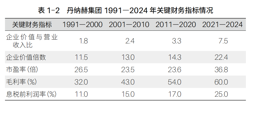 随着盈利指标的提升,丹纳赫的估值倍数也在提升。比如,在企业估值中最常见的企业价值倍数从 20 世纪 90 年代的平均 11.5 倍提升到了2010—2020 年的 14.3 倍,从 2021 年起的 4 年里甚至高达 22.4 倍(见表 1-2)。